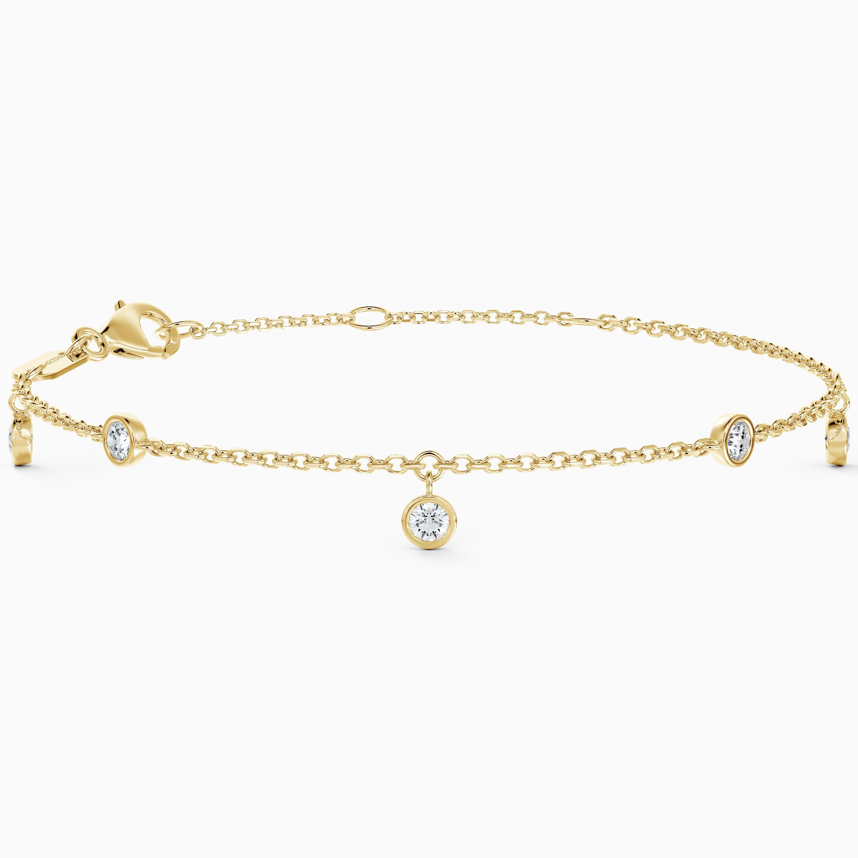 Encircling the wrist, five bezel-set diamonds provide an elegant accent in this Clea bracelet. Set along a fine chain of timeless 18K yellow gold, the five diamonds, totalling ~0.35 carats, alternate in their arrangement, from punctuating the chain to being suspended from it, for a playful, asymmetric look. Every diamond in the My First De Beers collection is ethically sourced, selected by eye for its Fire, Life and Brilliance and set by hand. Capturing the light as the wearer moves, this diamond bracelet is a testament to the beauty of a well-placed diamond.