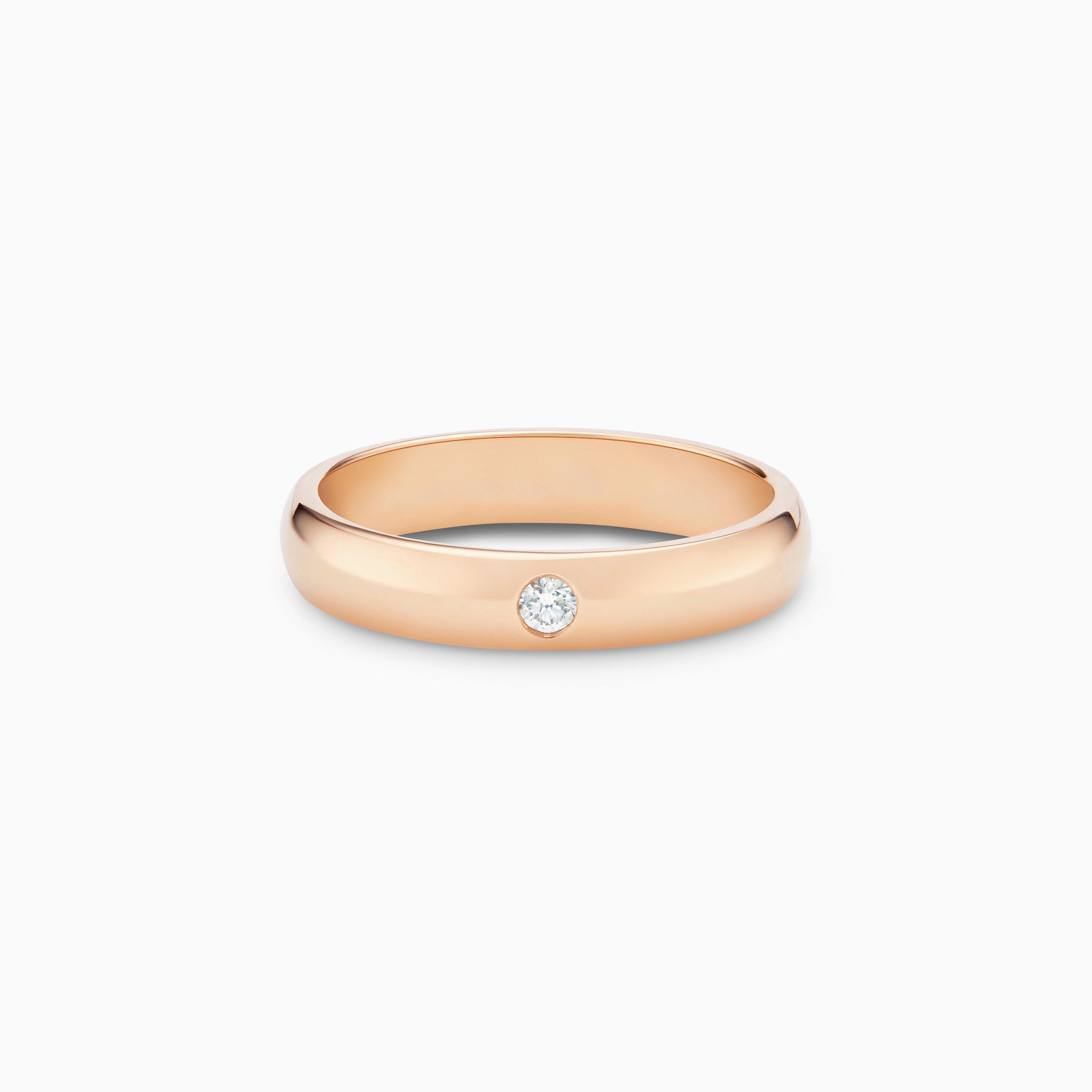 The Classic One Diamond Band is a traditional symbol of enduring love, made modern. Composed in 18K rose gold at a width of 4.0 mm, it is timeless and traditional, but with the alluring addition of a ~0.05 carat round brilliant diamond set into its band. Ethically sourced and selected by eye by De Beers’ team of experts, the diamond serves as a visual reminder of a loved one, making this piece a natural choice for a wedding ring.