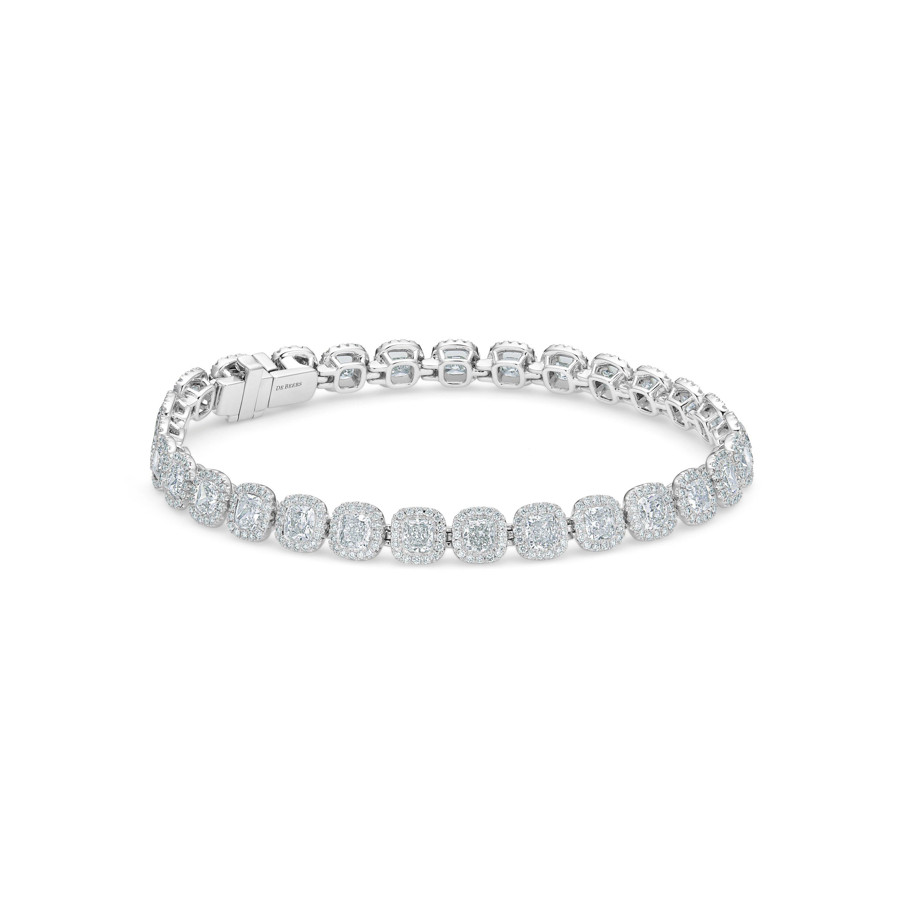 This exceptional 18K white gold and diamond bracelet, part of the Aura collection, is exemplary of the skill of De Beers’ artisanal craftspeople. It is comprised of individual natural diamonds, each one ethically sourced, selected by eye and meticulously hand-set to best demonstrate its innate beauty. A row of prong-set cushion-cut diamonds forms the body of the piece at a length of 18.0 cm, each one encircled by a row of smaller round brilliant diamonds in the halo of radiant light from which the collection takes its name.