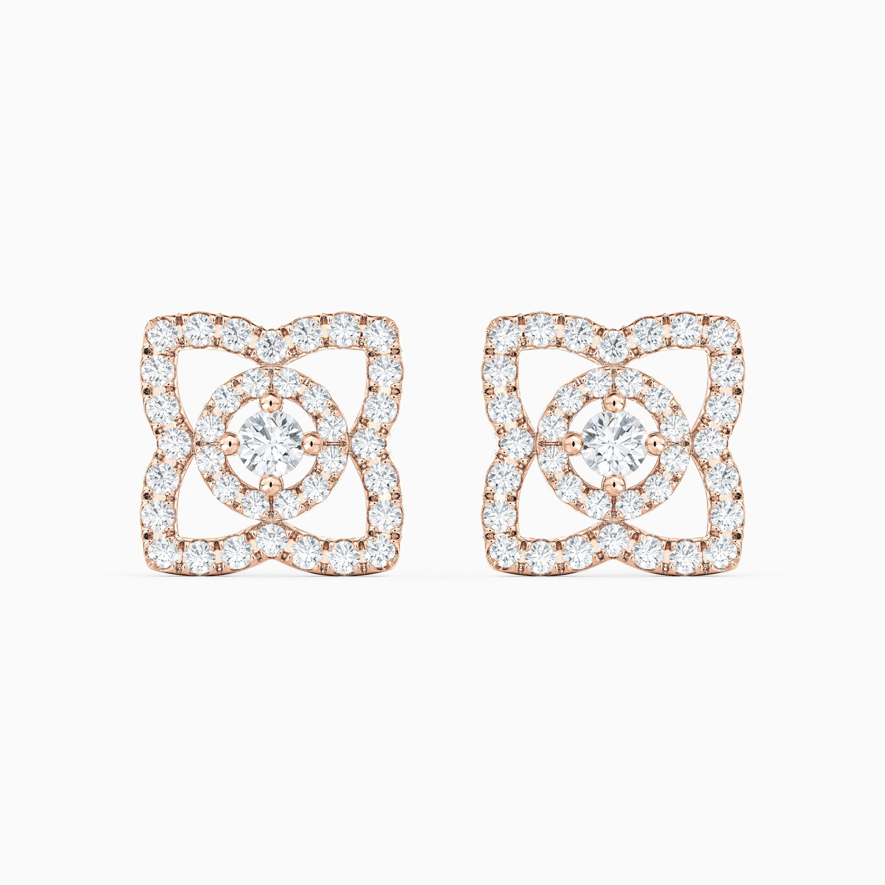 Elegant and understated, these 18K rose gold and diamond earrings are created in the image of the lotus flower, which has long symbolised purity and eternity. Each one sees meticulous rows of micropavé diamonds set in rose gold in the form of petals encircling the round brilliant diamond at their centre. The total weight of the diamonds in this piece is ~0.32 carats. Each diamond has been consciously sourced, selected by eye and set by De Beers’ team of craftspeople.