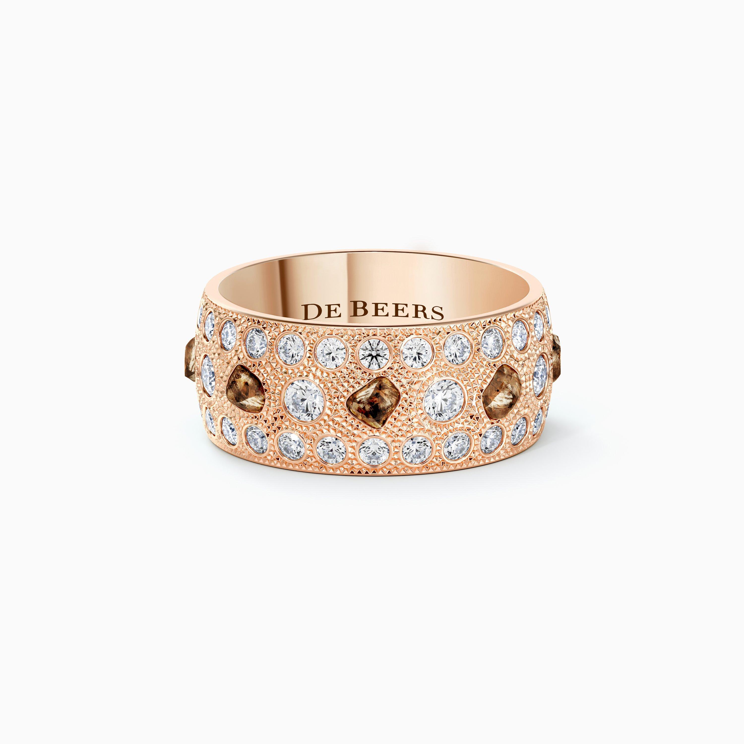 The combination of rough and polished white and fancy colour diamonds in this ring embodies the beauty of the original talisman. Considered a symbol of power long before they became a symbol of love, rough diamonds in themselves were worn as talismans, and so are the focus of our Talisman collection. The 18K rose gold, at a width of 8.0 mm, provides the ideal canvas on which to showcase ~70 individual diamonds, totalling ~1.82 carats. Arranged next to round brilliant and rose-cut polished diamonds, rough diamonds are brought to life in this bold design.