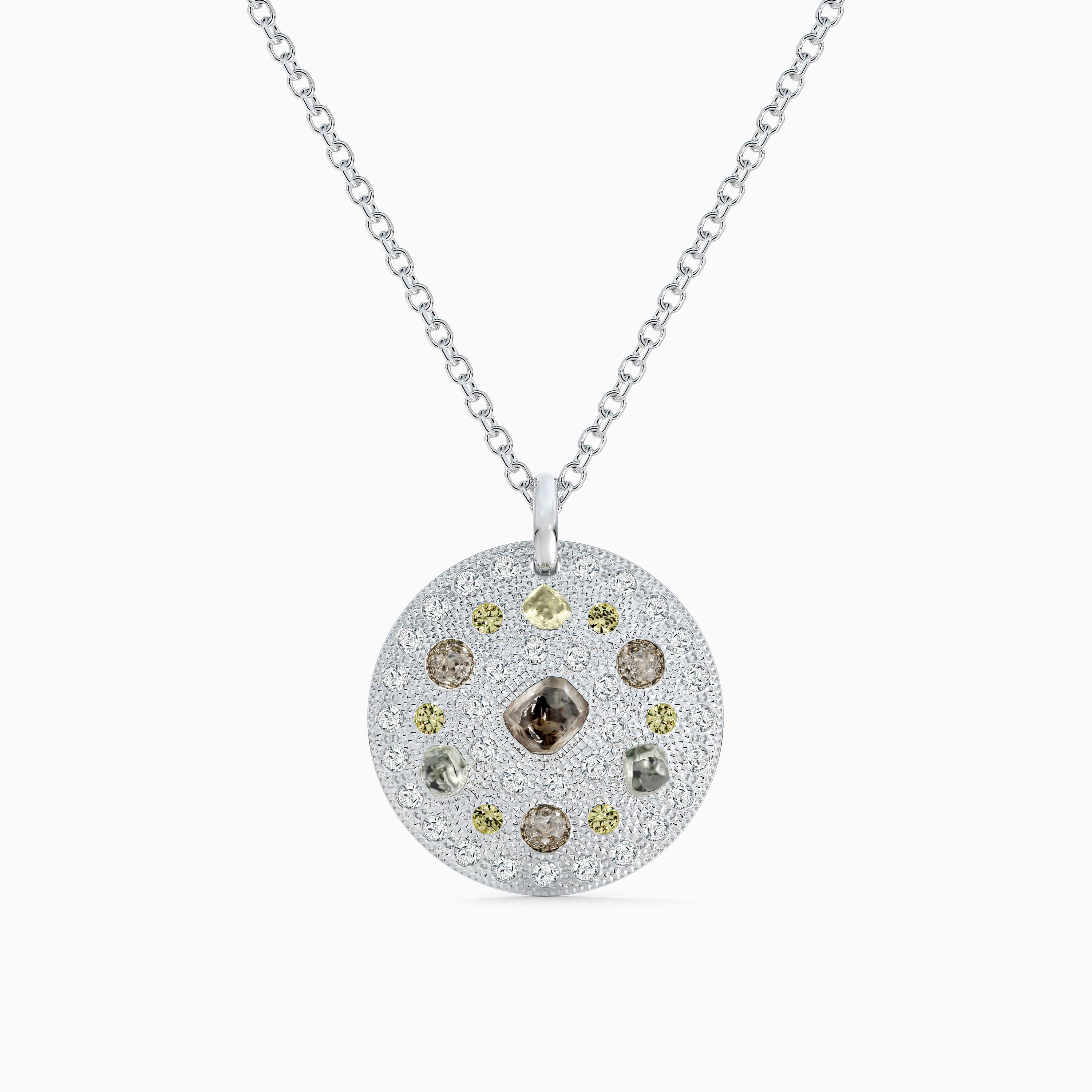 Radiating from a brown octahedral rough diamond, an encircling constellation of rough and polished diamonds enhance this iconic Talisman medallion’s raw beauty. The combination of 46 round brilliant, rose-cut and rough white and fancy colour diamonds, totalling ~2.20 carats, is a De Beers signature. Each is meticulously set using our serti poinçon technique, where the 18K white gold is hand-hammered to encapsulate the diamonds on the 23.0 mm-wide medallion. The diamond necklace is set on a chain 42.0 cm in length, with a sizing loop at 39.0 cm. This finish lends this medallion a singular tactility – enhancing its rare character, matched only by the person who wears it.