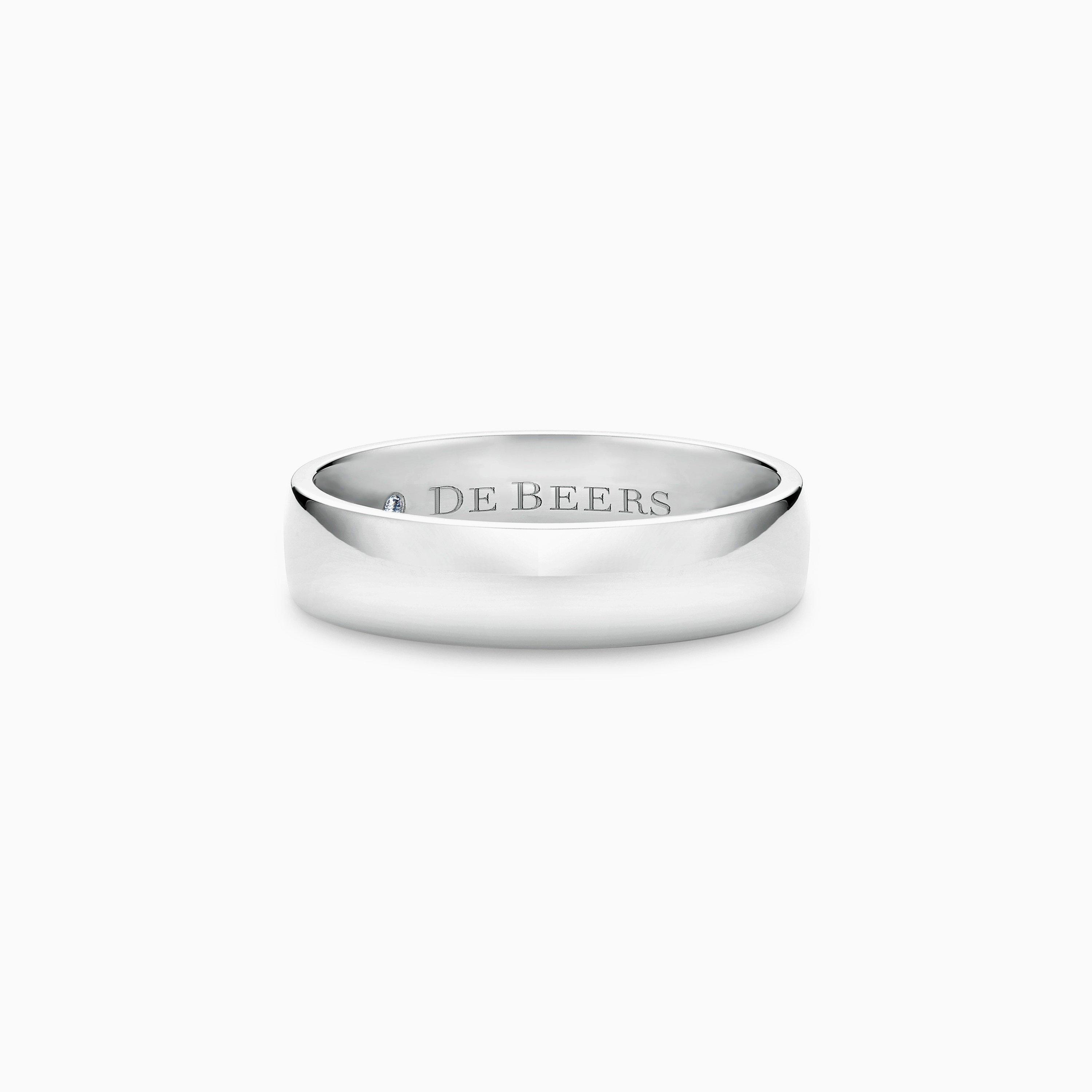 Our wedding rings reimagine a classic symbol with a thoughtful and authentic new touch. Created in platinum at a width of 5.0 mm, this iteration is simple, clean and sculptural – an elegant ornament by which to a mark a life lived together. On its inside band sits a hidden diamond, its presence known only by its wearer.