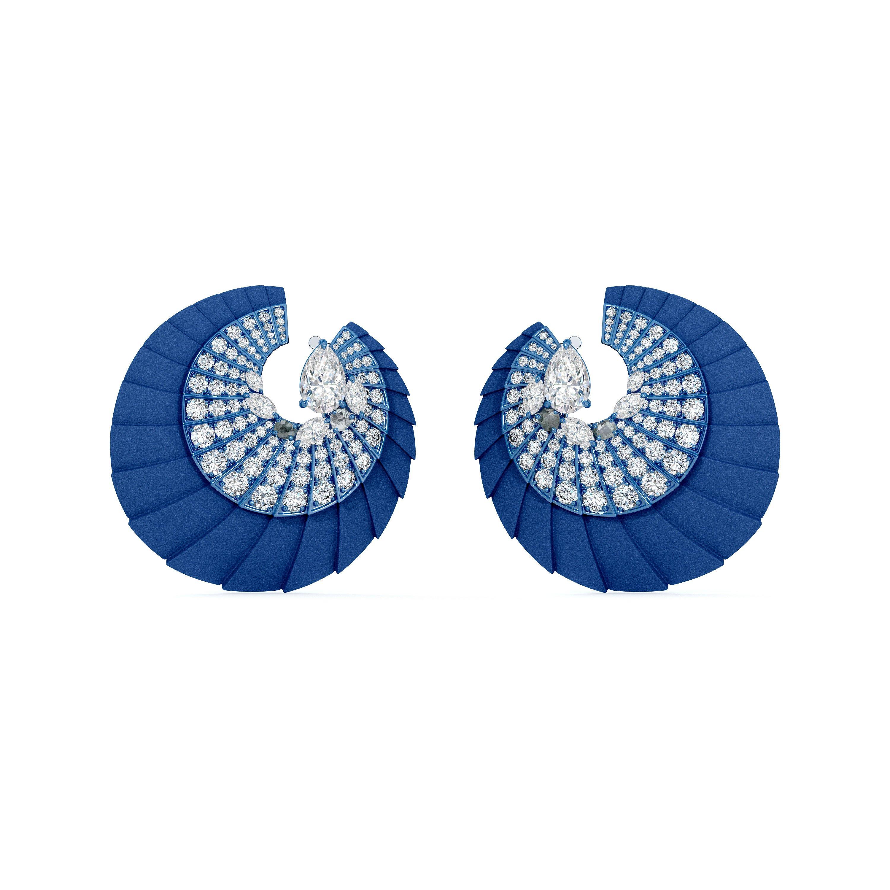 Inspired by the way stepped surfaces dramatically play with light and shade, and reminiscent of the spiral staircase in De Beers new flagship store in Old Bond Street, London, these large hoop earrings fan out, echoing the dynamic movement of the spiral form. The outer dark blue aluminium steps have a subtle sanded finish that gives them a tactile matte quality, while the contrasting light blue titanium is pavé-set with graduating round brilliant white diamonds in a sparkling swirl. The focal point is a 1.01 carat pear-shaped white diamond, surrounded by prong-set white marquise-shaped diamonds and green roughs, set on an 18k white gold clasp.