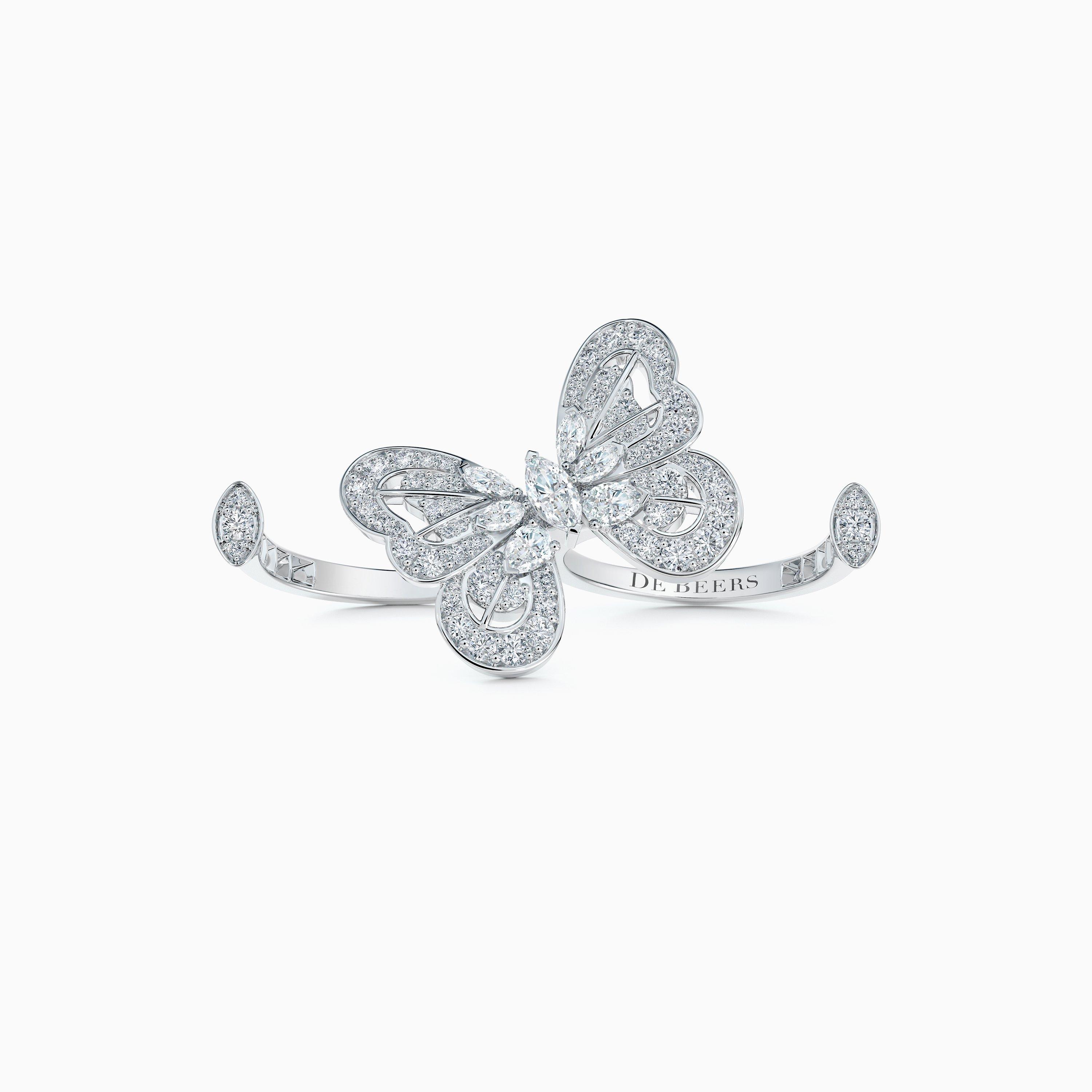 The modern elegance and free-spirited playfulness of the collection is captured in this graceful double open ring. The butterfly appears as if it is just sitting on the hand, capturing an ephemeral moment in time. Illuminated with white micropavé-set diamonds, totalling ~1.67 carats, the body of the butterfly is represented by a marquise diamond. Set upon an 18K white gold band, the delicate openwork design allows natural light to travel through the wings, resulting in exceptional sparkle from every angle.