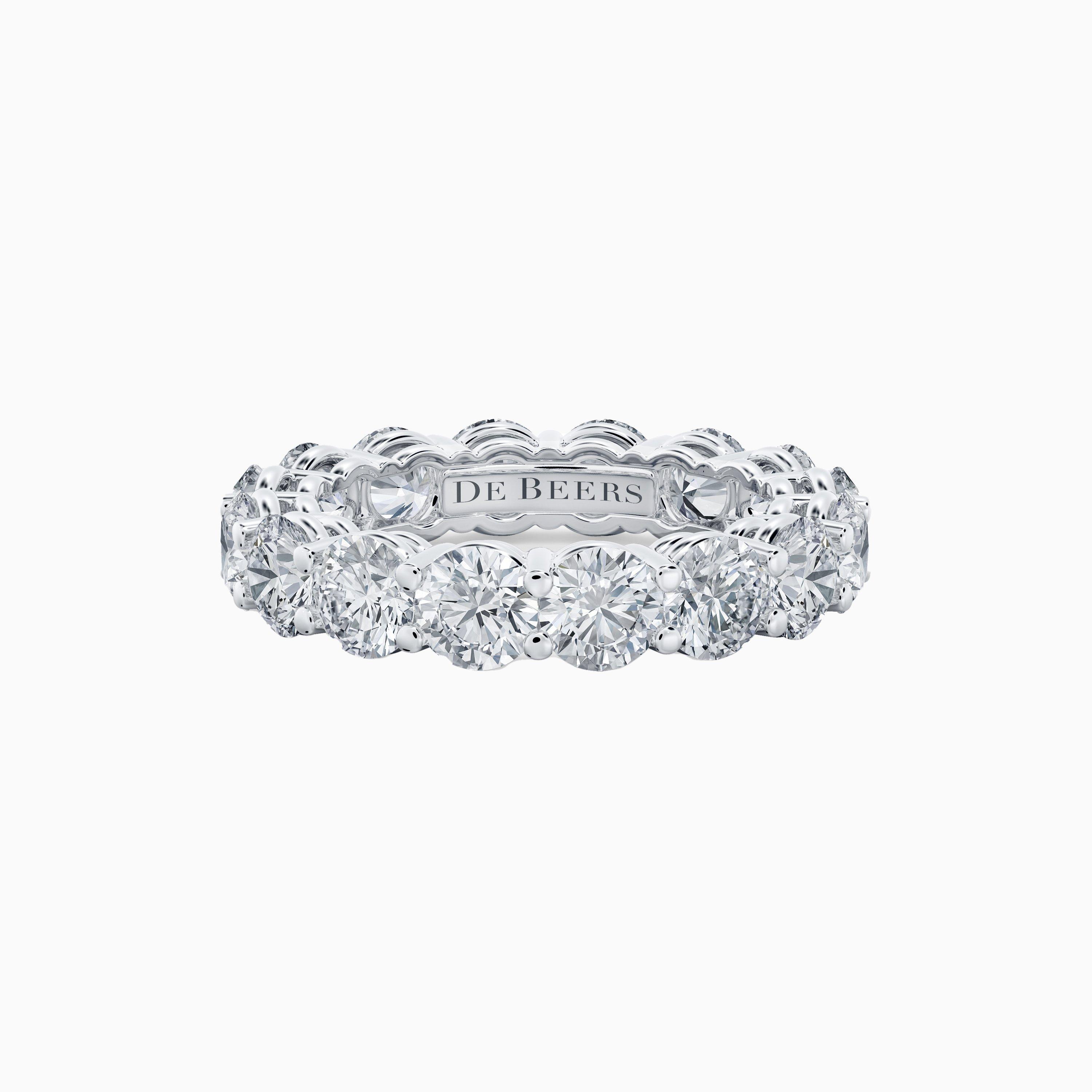 A single row of round brilliant diamonds totalling ~5.28 carats, line this diamond eternity ring, creating a contemporary feel. All the diamonds in this platinum band have been ethically sourced and hand selected by De Beers’ team of experts, before being perfectly matched to ensure the balance of the resulting piece. Elegant and refined, this is an impactful diamond band.