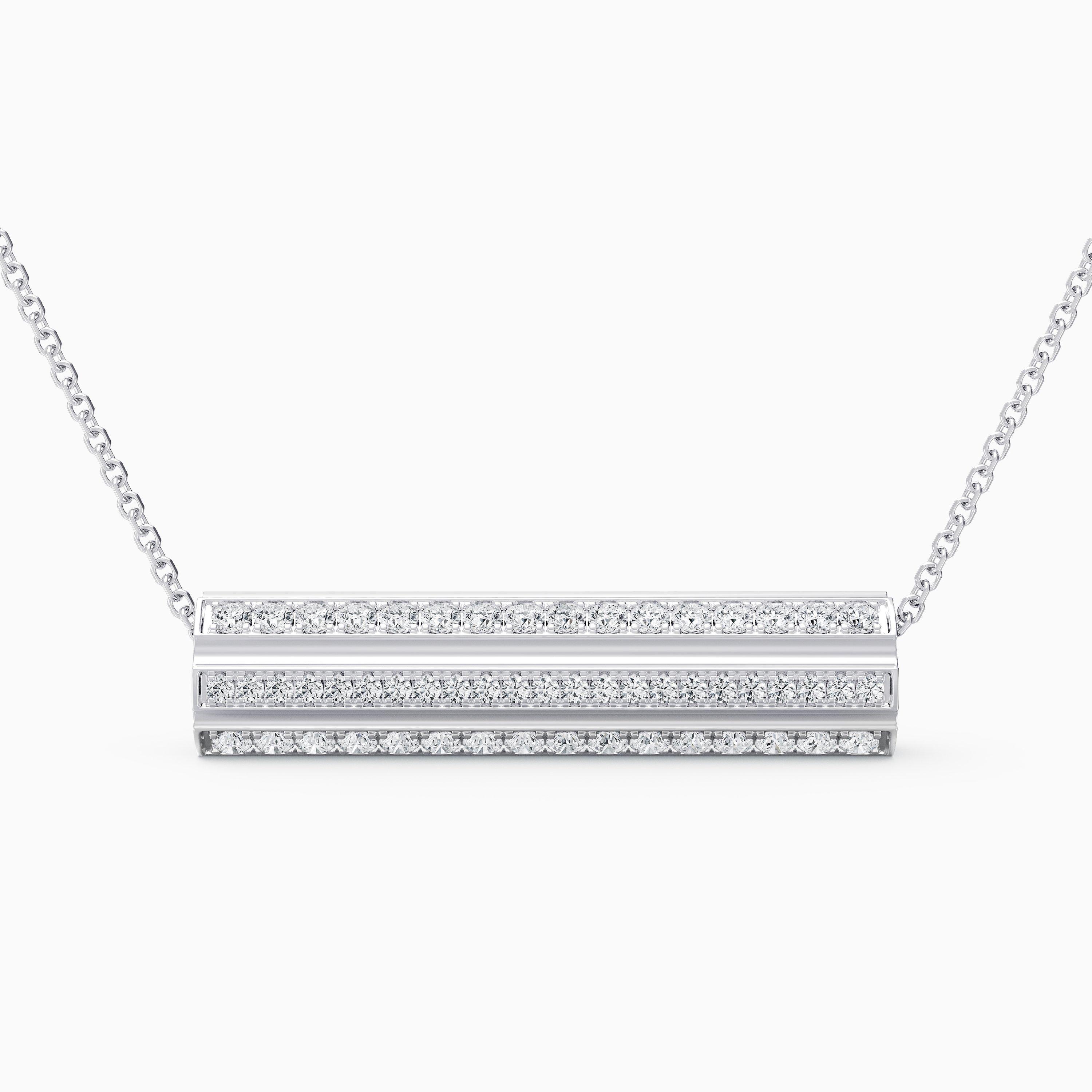 The De Beers RVL pavé diamond pendant in white gold sees the collection motif translated into a horizontal cylindrical shape, its sleek silhouette highlighted with diamonds. The bold and contemporary design incorporates the De Beers monogram, with a subtle D and B imprinted into the metal like a code, emboldening the wearer to express their extraordinary self.