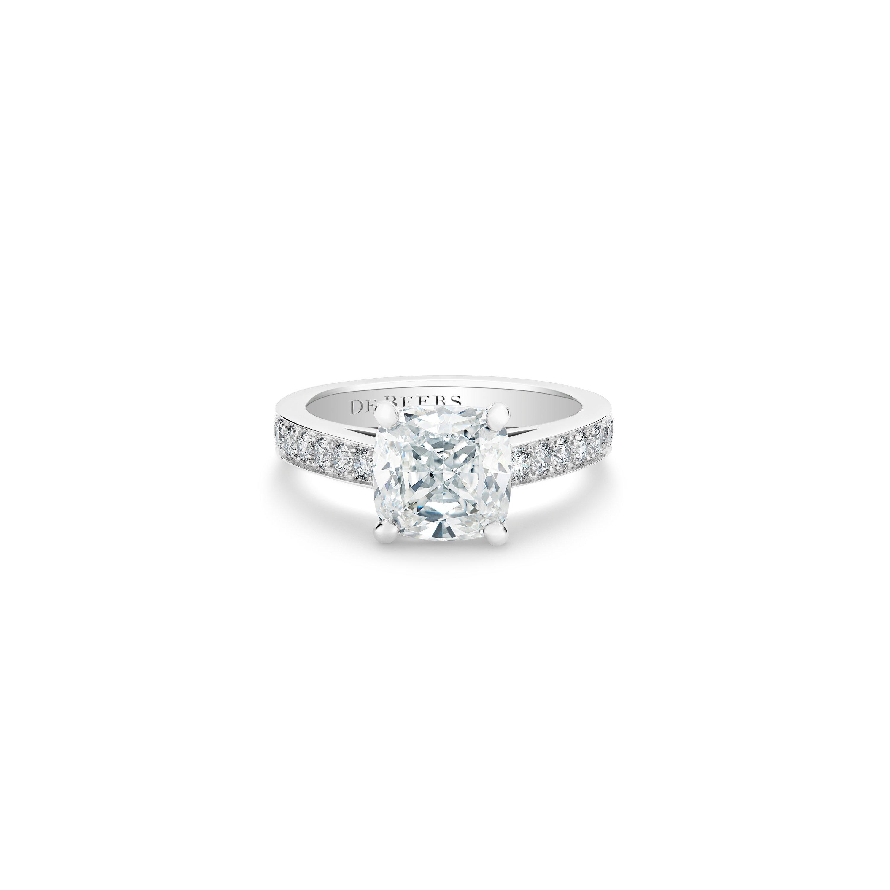 Named after De Beers’ flagship London store, the Old Bond Street solitaire ring is a modern and elegant take on a classic diamond ring. It is composed around the cushion-cut diamond at its centre. Prong-set in platinum, this diamond is set upon a band lined with 16 round brilliant micropavé diamonds, each of which serves to accentuate the Brilliance of the hero diamond.