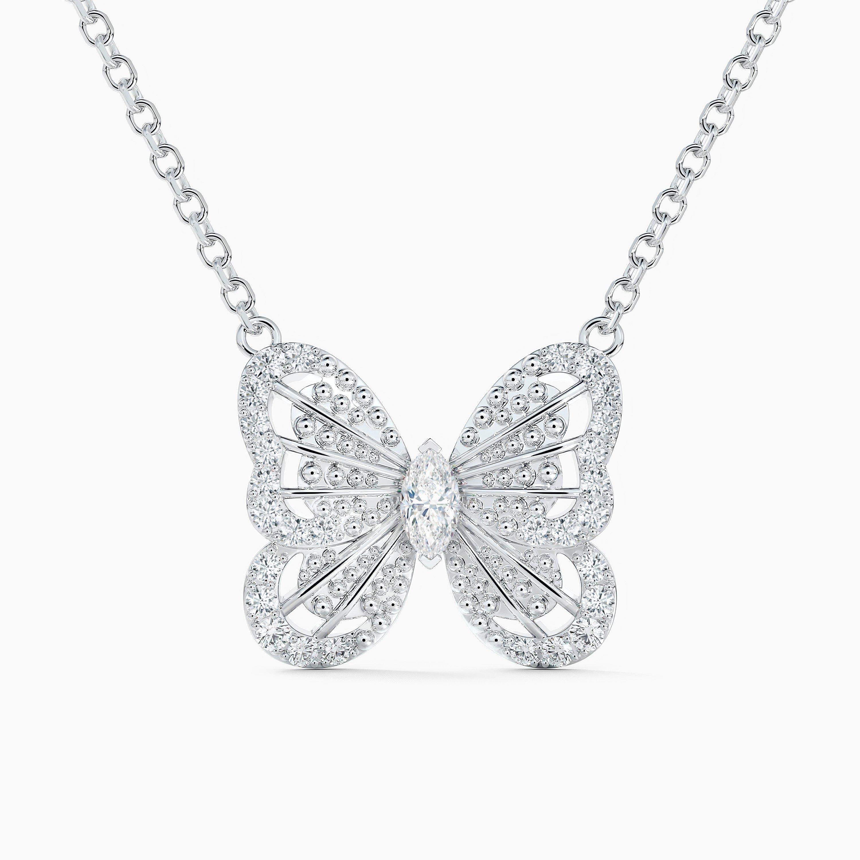 A timeless pendant that captures the iridescence of a butterfly’s wings, illuminated with exceptional white diamonds, totalling ~0.21 carats. Rich in detail, the pendant features a marquise-shaped diamond and delicate openwork design which allows natural light to travel through the wings, resulting in exceptional sparkle from every angle.