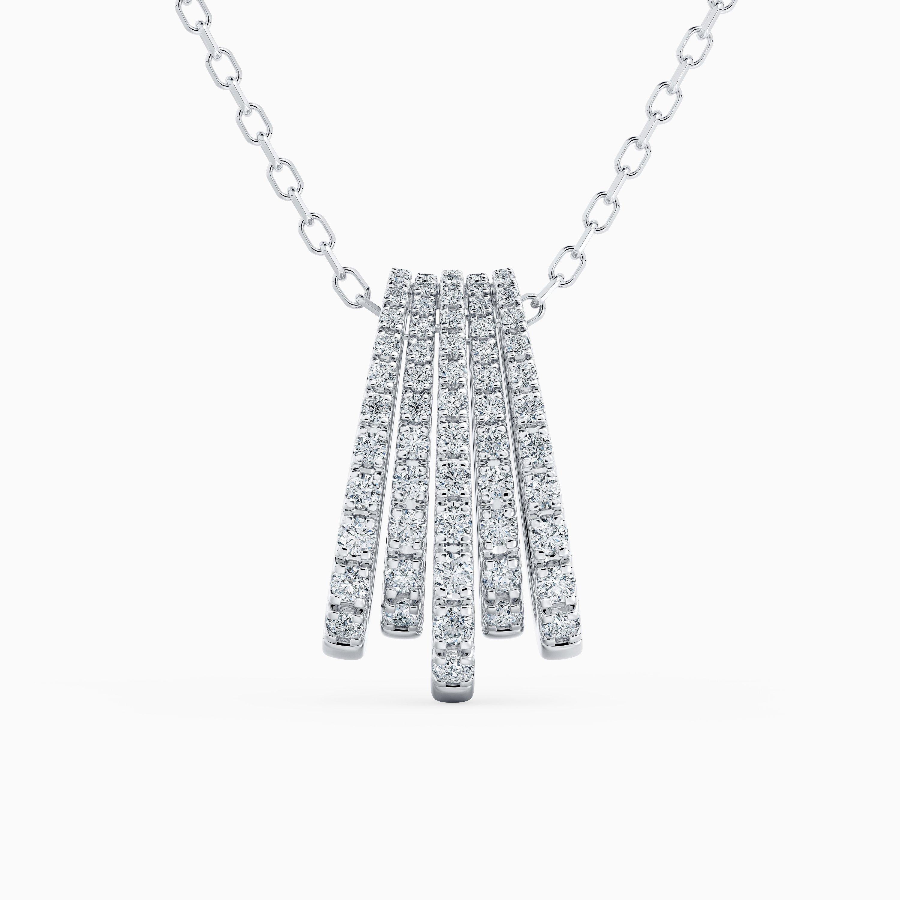 這款鑽石吊墜項鏈精緻優雅,以俏皮風格演繹經典設計。 五行由圓形明亮式切割鑽石呈現的線條以弧形造型和諧組合而成。 作品鑽石總重量約0.73克拉,每顆鑽石均以遵循道德規程的方式採購,並由De Beers專家團隊根據火彩、生命力與亮光逐顆甄選。 這款作品滿蘊現代格調,各個角度皆能綻放璀璨奪目的光采。。